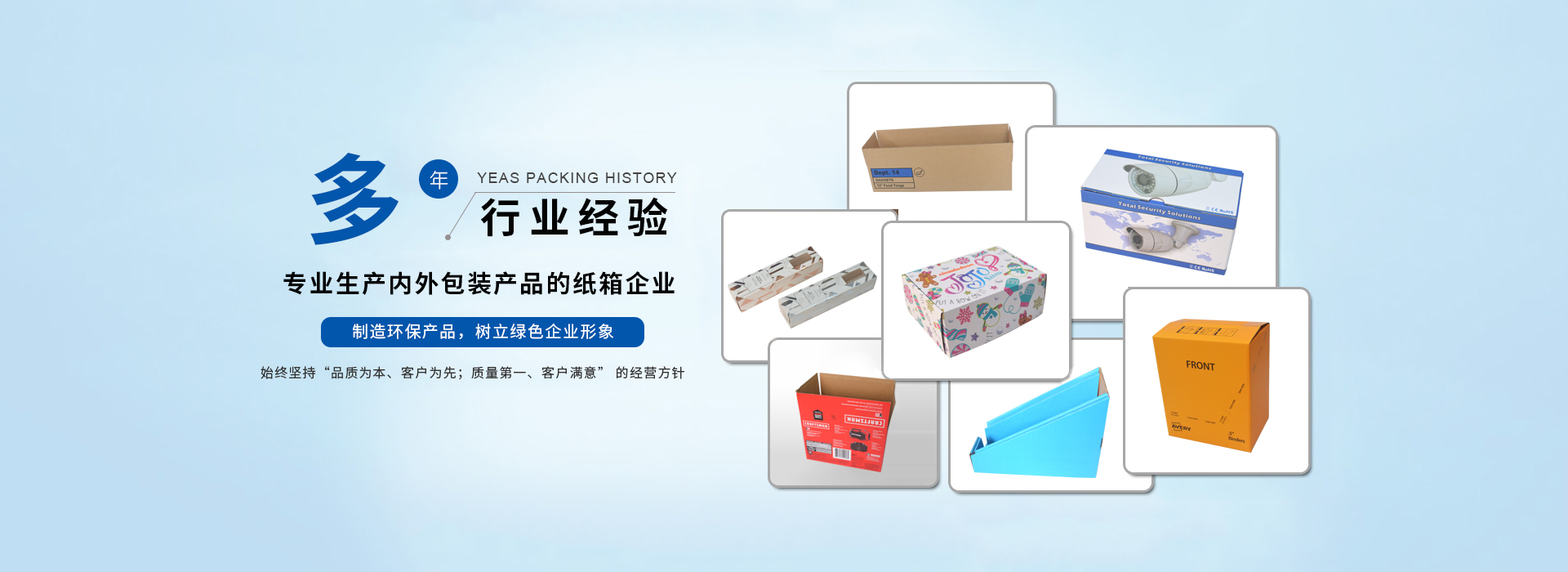 我司主要生產(chǎn)瓦楞紙箱、隔板,禮品盒、彩盒,啤盒;啤卡 ,紙護角 ,紙卡板,說明書,不干膠,珍珠棉,輔助包材集生產(chǎn)和銷售于一體;公司在材料采購、生產(chǎn)控制、成品檢驗、售后服務包裝需求嚴格執(zhí)行ISO9001質(zhì)量體系標準;我公司目前為SONY,欣旺達電子,嘉盛照明,庫偉實業(yè),洲明節(jié)能科技; 泛美照明科技, 怡化金融設備,美利龍餐具,中天世紀,東芝電器 ,共進電子等大中型企業(yè)公司配套供應包裝紙箱,建立了穩(wěn)定的合作關(guān)系。
